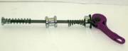 This is a quick release skewer with a colored lever. Alloy lever with cam actuation. CROMO shaft. Measures about 5 1/2". Purple lever.